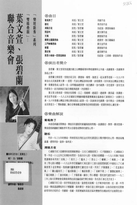 葉文宣、張碧蘭聯合音樂會 : 雙姝疊韻 / 葉文宣南胡; 張碧蘭琵琶; 林錦蘋揚琴; 陳倩芬, 詹錦斐鋼琴演出.