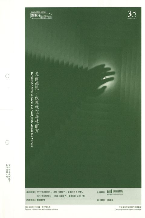 李銘宸《戈爾德思:夜晚就在森林前方》= : Bernard-Marie Koltès : La Nuit juste avant les Forêts / 李銘宸 , 導演 ; 楊奇殷(楊登鈞) , 演員 ; 黃緣文 , 演員 ; 曾歆雁 , 演員 ; 陳俊澔 , 演員 ; 劉曜瑄 , 演員