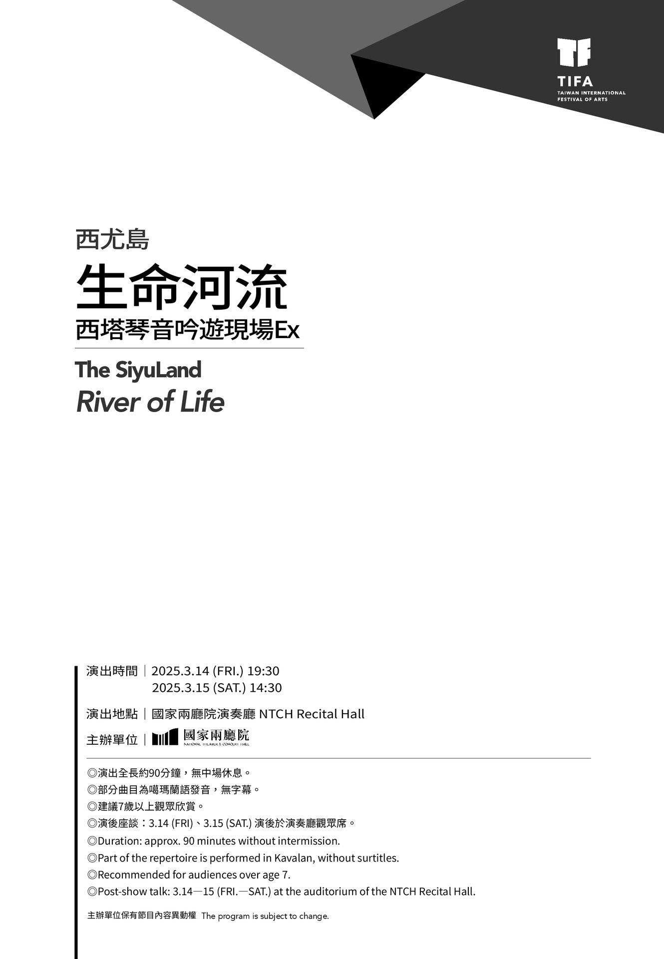西尤島計劃以民族迷幻三重奏為創作核心,由爵士鼓、鋼琴,及西塔琴手兼主唱組成,演出足跡遍佈海內外。此次為TIFA量身打造,融匯噶瑪蘭族傳統元素,以獨唱和合唱形式,重現部落儀式質樸氛圍,亦引入印度傳統配器,特邀印度音樂家艾凱旭.杜貝擔綱塔布拉手鼓及吟唱。期望在生命的河流中,為每位相遇之人,帶來更深邃的音樂風景。