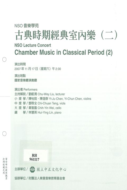 古典時期經典室內樂(二) = Chamber music in classical period (2) / 劉岠渭, 主持解說 ; 陳怡茹 , 陳逸群 小提琴 ; 鄧啟全 中提琴 ; 韋智盈 大提琴 ; 林慧英 鋼琴.